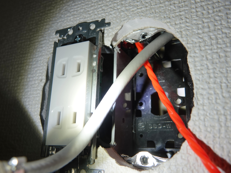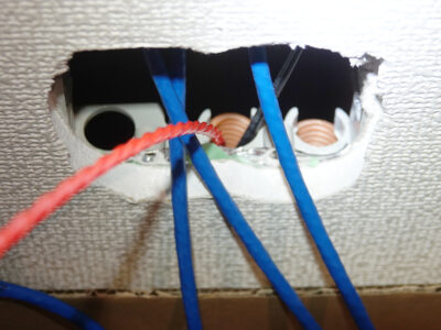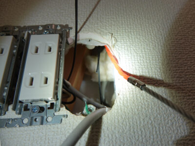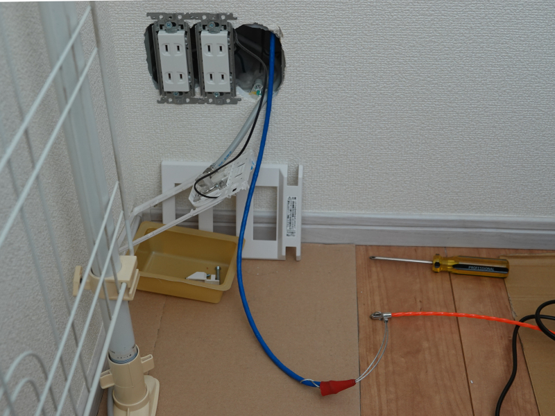 この時見た工事をまねて、2階の部屋から2階の物置に配管を利用して通線スチールワイヤーを通して見た。配管のおかげで割合簡単にスチールワイヤーは通った。通したスチールワイヤーの先にLANケーブルをくくり付け部屋から物置方向に引っ張ってケーブルを通した。この時、物置は狭いので広い部屋でRJ-45コネクタを取り付けたケーブルを通した。これが間違っていた。物置のマルチメディアパネルのケーブルアダプターの穴は小さく、RJ-45コネクタは通らないのだ。仕方ない、引き抜こう、割と簡単に通るので、LANケーブルだけでパイプを通らないだろうか?やってみた、これがまた間違い、パイプの先端が見えないので壁の空間にケーブルを押し込んでしまった。また抜いた、抜くとき絡まって、一部鋭角に折れ曲がってしまった。コネクタを付けない新しいケーブルを通すことにした。