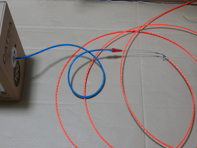 2階の部屋間で練習できたので、一番重要な、2階の物置から1階のシステム設置マルチメディアパネルまでケーブルを通す作業に取り掛かった。このパイプには既に光ファイバーが通されているので、そのケーブルに傷をつないよう注意して作業しなければならない。