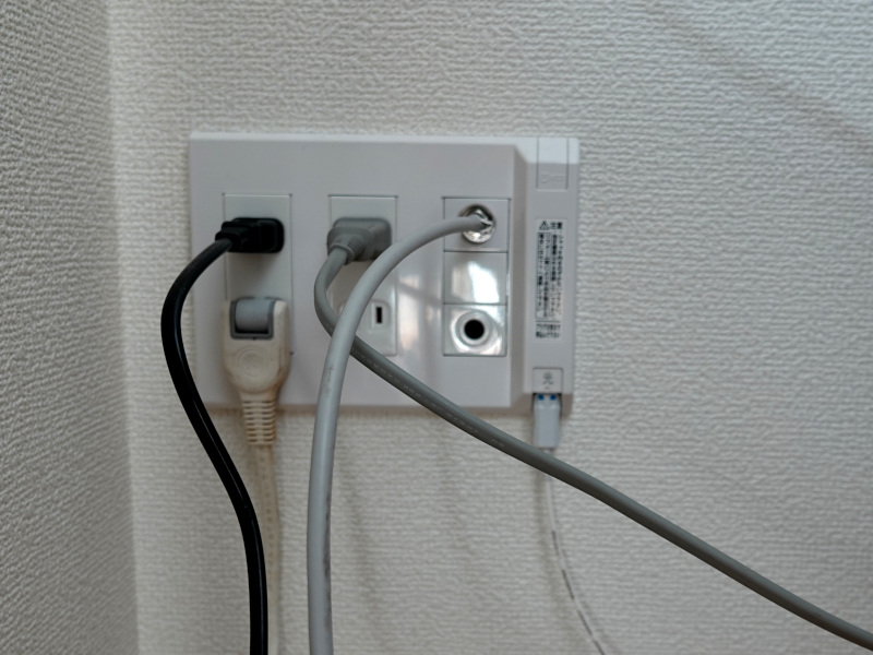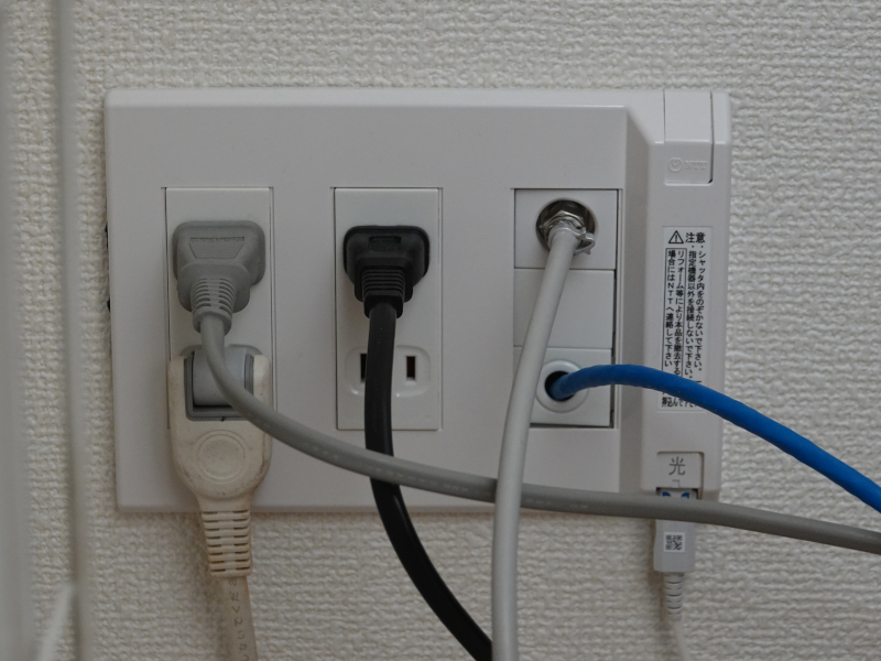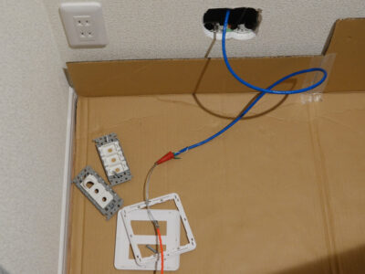 1階のマルチメディアパネルはNTT工事者が取り替えて付けたもので写真の右側に光コネクタが用意されている。パネルを外すと左側に2列のACコンセント、右側にテレビ端子、右端に光コネクタが付いている。黒い細いケーブルに光ファイバーが収納されている。物置のマルチメディアパネル内部に見える光ケーブルの通してあるパイプを通して1階方向にスチールワイヤーを通した。ワイヤーを押し込めなくなったので1階のマルチメディアパネル内部を見るとワイヤーの先端が見えた。物置でLANケーブルを針金でワイヤーに括り付けて、1階から引っ張った。ここでまた失敗、途中でLANケーブルがスチールワイヤーから外れてしまった。括り付けた針金がパイプ内に残されたようだ。ここには光ケーブルが通っているので心配になった。仕方がない、再度やり直した。今度はLANケーブルが物置から1階まで通った。1階ではLANケーブルをそのまま伸ばしマルチメディアパネルを通し先端にRJ-45コネクタを取り付けルーターに接続する。マルチメディアパネルを元に戻して、動作を確認した。テレビが映り、Wi-Fiを通してインターネットにアクセスできる。光ケーブルに障害を与えてはいなかったようだ。