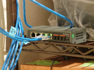 物置にスイッチングハブを置いて、2F物置 – 2F東室間、2F物置 – 1F居間の2本のケーブルをスイッチングハブに接続した。2F東室で確認すると正常にインターネットを閲覧できた。