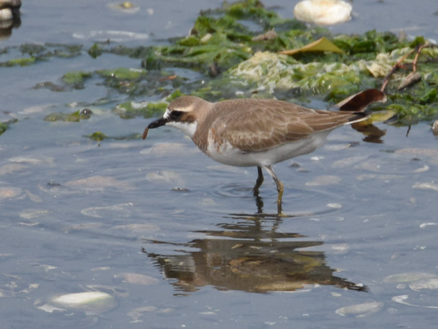姿は似ているが、色の薄いこの小鳥はメダイチドリのメスだろう。 The shape of the body is similar as the above plover, but the plumage is quiet. This plover will be a female of the Lesser sand plover.
