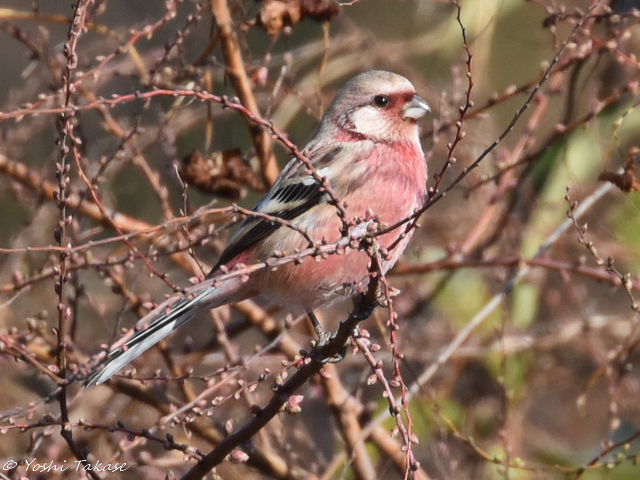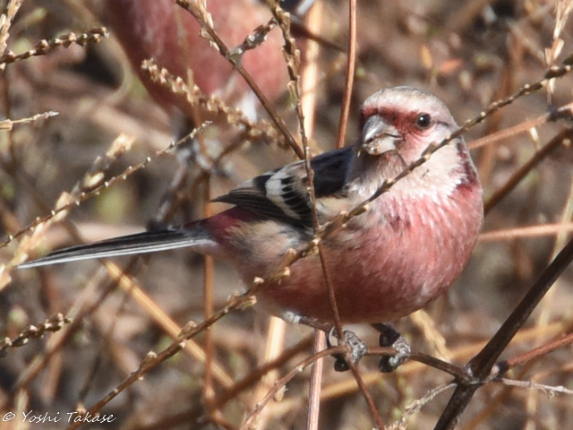 In winter, Long-tailed rosefinch gathers in an open space near Sakurasou Park.