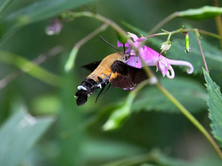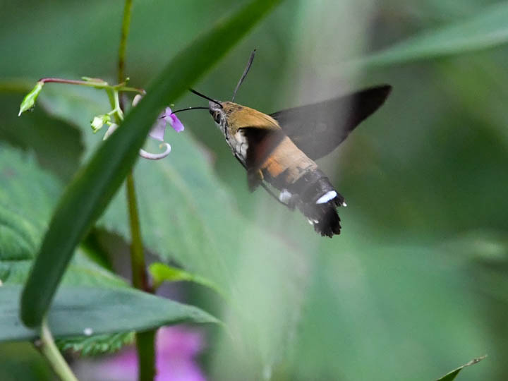 こんぶくろ池自然博物公園を訪れるとワタラセツリフネソウの花がまだ咲いていた。今回見たスズメガはよく見かけるホシホウジャクと違って見えた。写真を見るとヒメクロホウジャクのようだ。