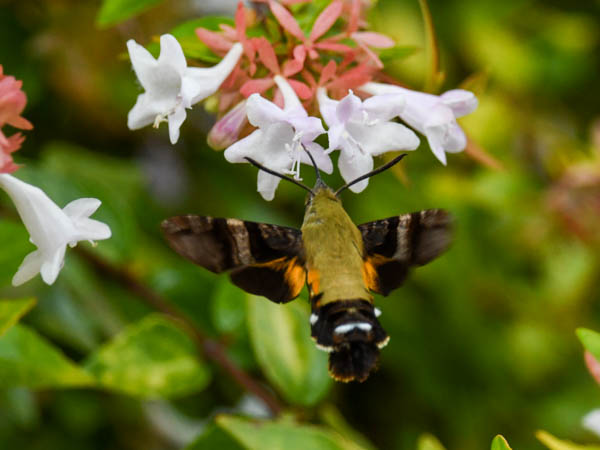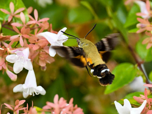 There was a hawk moth that was hovering in midair while it fed on nectar from the flowers of Abelia in their hedge on the sidewalk of Kashiwanoha Campus First Avenue This hawk moth will be Macroglossum bombylans.