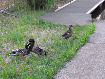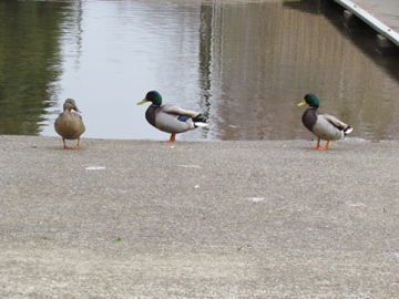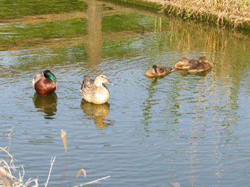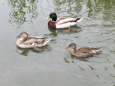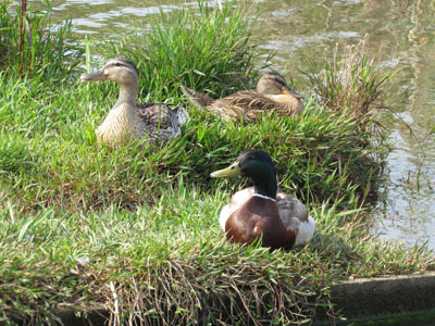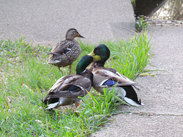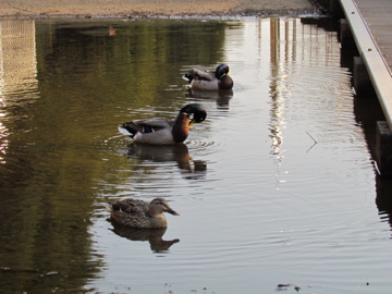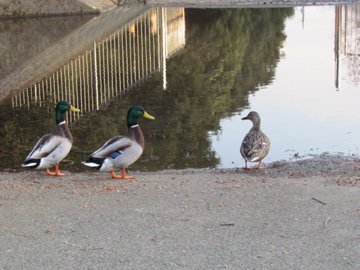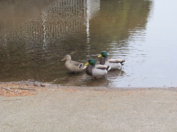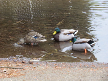 池への水路の所に3羽のマガモがいた、1羽のメスと2羽のオスだ、オスの頭部は繁殖期の輝く緑色になっている。(柏の葉公園 2011/1/26)