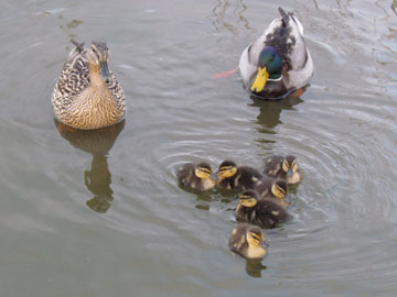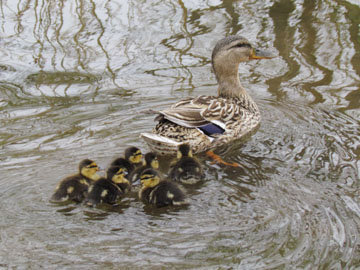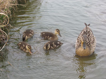 散歩道近くの草むらからマガモが池に入った、それを追って6羽の雛、ここで繁殖しているマガモがいるんだ。(柏の葉公園 2011/4/18 16:27)