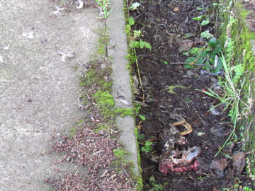 散歩道に羽毛が散乱、横の側溝にマガモの雛の死骸、肉だけ無くなっている、犯人はカラスのようだ。(柏の葉公園 2011/5/24 16:03 )