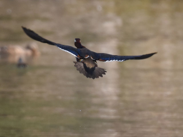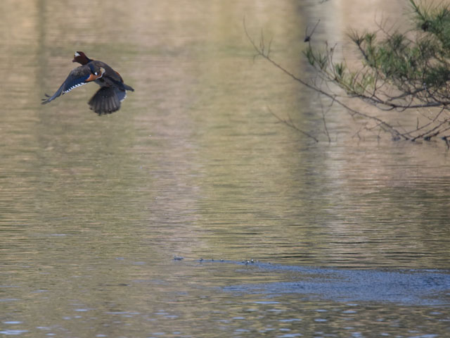 オシドリが飛んだ姿を追ってみた。なるほど、空を飛んでいるオシドリは他のカモと区別しにくい。そのため誤って撃たれることも多いと言う。
