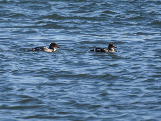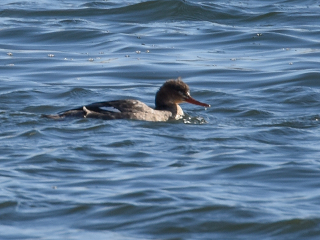 この3羽は他のカモと違って見えた。カワアイサかウミアイサのようだ。遠かったので鮮明ではないが、頭部と胸の羽衣の境目が不明瞭なことからウミアイサと思われる。ウミアイサは新旧世界の北方地域に分布し、日本へは冬鳥として渡来する潜水カモの一種だ。