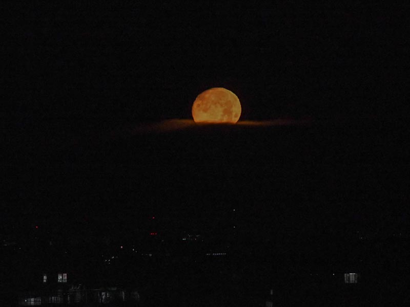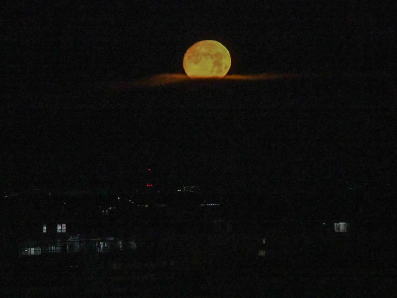 太陽が西の地平線に沈む光景はおなじみです、でも月の沈む光景は意識して見たことはなかった。空はまだ暗いのでより神秘的な雰囲気です。上空では白っぽく見えた月も地平線近くなると赤っぽく見えます。