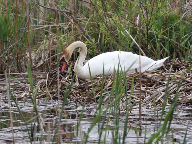 2016年4月22日、我孫子市にある手賀沼公園を散歩した。この沼では、外来種であるコブハクチョウが定着し繁殖している。 つがいが枯れた葦の茎を集め大きい巣を作っていた。