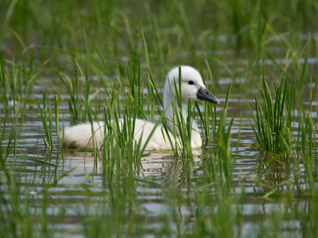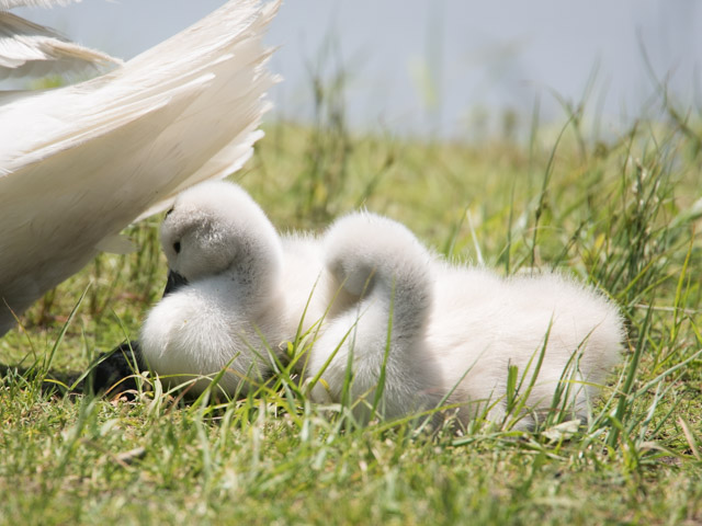 コブハクチョウの巣作りを見てから約1か月後、親鳥と一緒に2羽の雛がいた。雛はくちばしが黒くこぶはない。