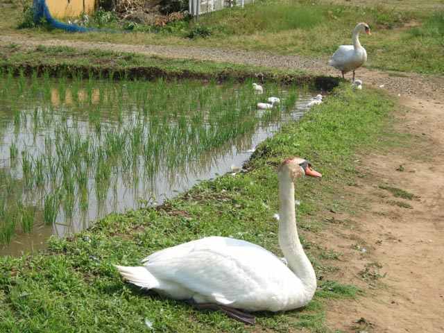 This place is a rice field. The parent and chicks of the mute swan were pecking leaves of the newly planted rice. The owner of the rice field was farming near and said “Oh, dear, dear! What shall I do with them?”