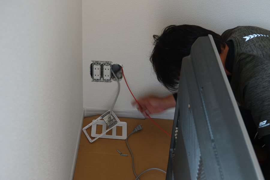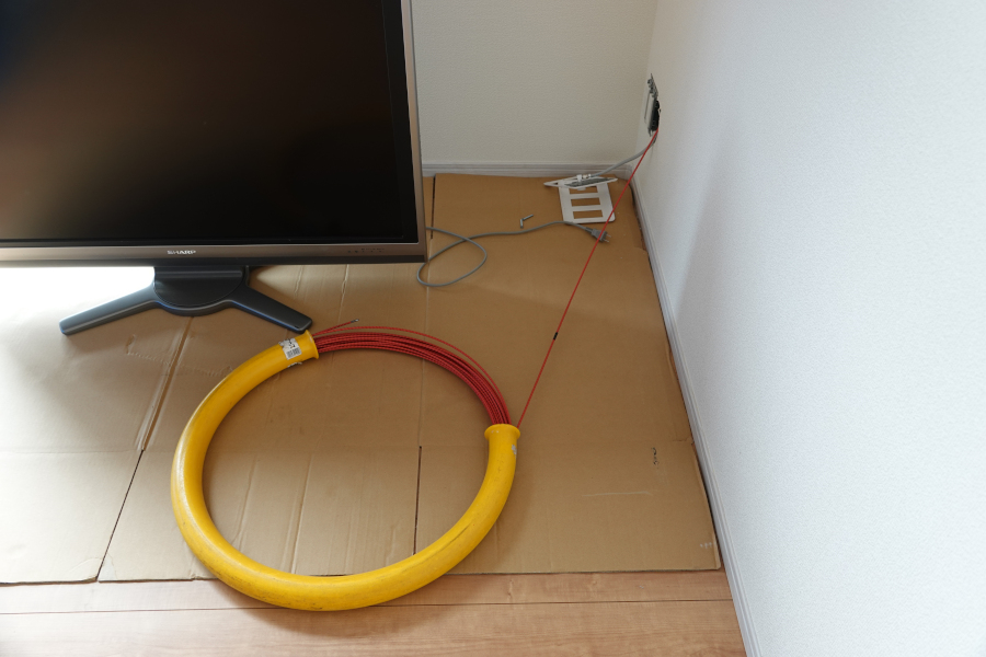 室内作業:あらかじめLAN配線用パイプを壁内に設置していた。このパイプに沿って通線工具スチールワイヤーを使って光ファイバーを引っ張り通す。