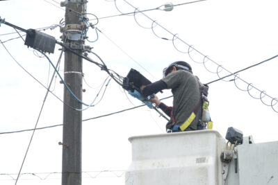 室外作業:クレーン車で高い位置に立ち、光ファイバーを近くの電柱の所に設置してある中継ボックスまで引いて(約40m)接続する。