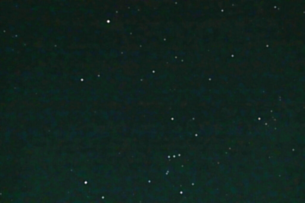 オリオン座が天中に見えた。星座を想像して写真を撮った。小さいサイズの写真では星の小さい輝点はほとんど見えないので、わざとぼかして明るく画像処理をしたら小さい画面でも見えるようになった。