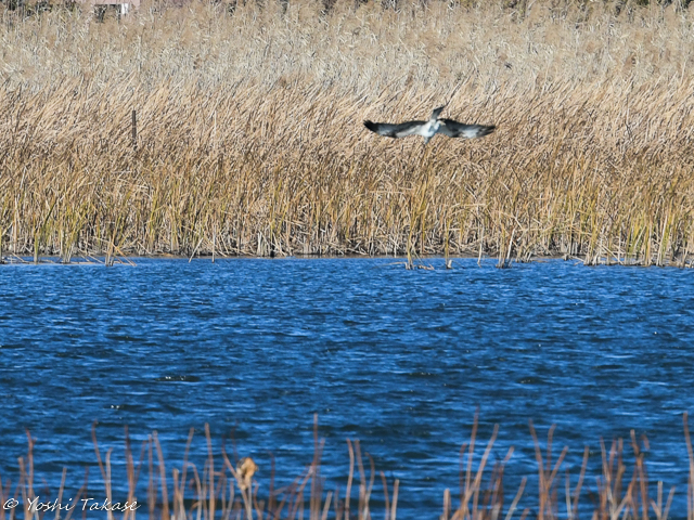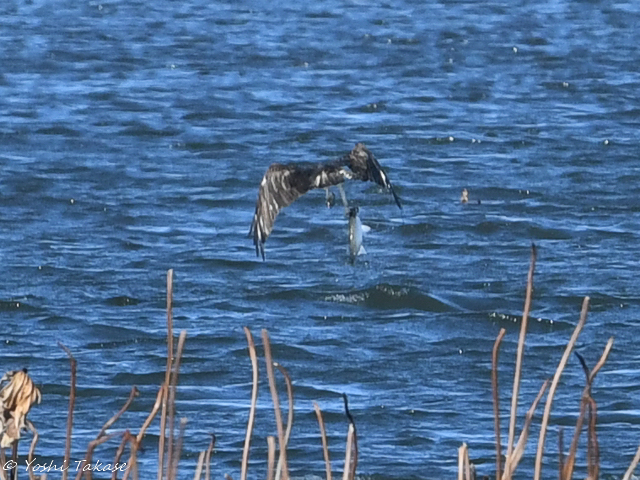 飛び上がったミサゴは片足に大きい魚を捕まえていた。ミサゴは魚を両足でしっかりつかんで水面近くを飛んで行った。ミサゴが近くを飛んでもコブハクチョウは無関心だ。
