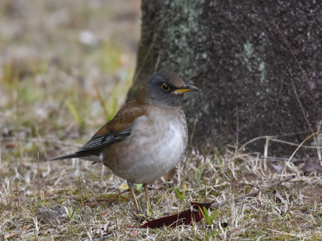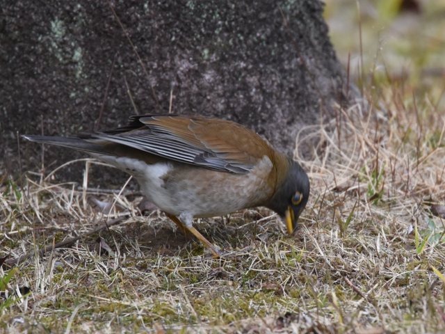 The bird was looking for bait while hopping on the ground followed by an upright posture. Indeed, it seems to be a bird of the thrush family. When the bird came to the base of the tree, it struck the ground. It seemed to have caught a insect, but I was not able to see what it was. Eat lots of food in Japan and return home in Eurasian continent cheerfully when it will be warm.