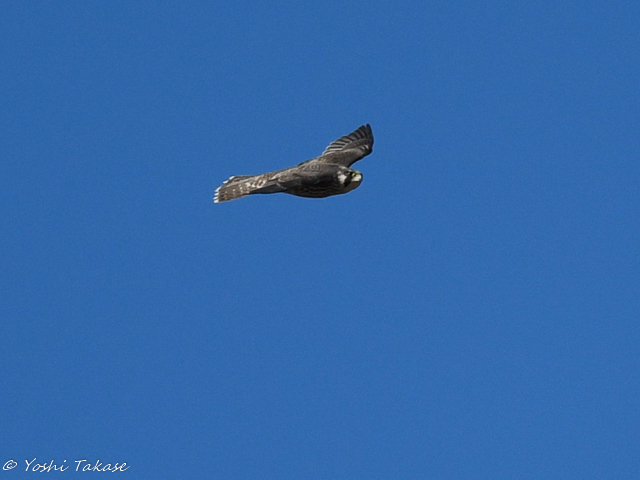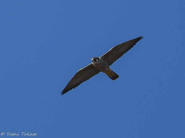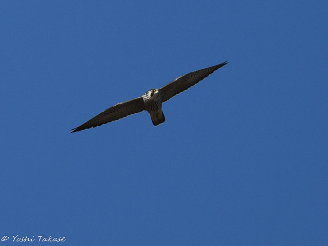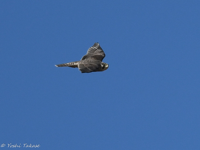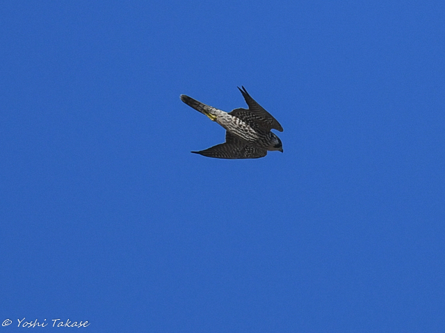 下から見上げた場合、ハヤブサとチョウゲンボウは似ているが、上面が見えれば羽衣の色で区別がつく。 この写真で背中の色が黒っぽく見えるのでハヤブサと分かる。