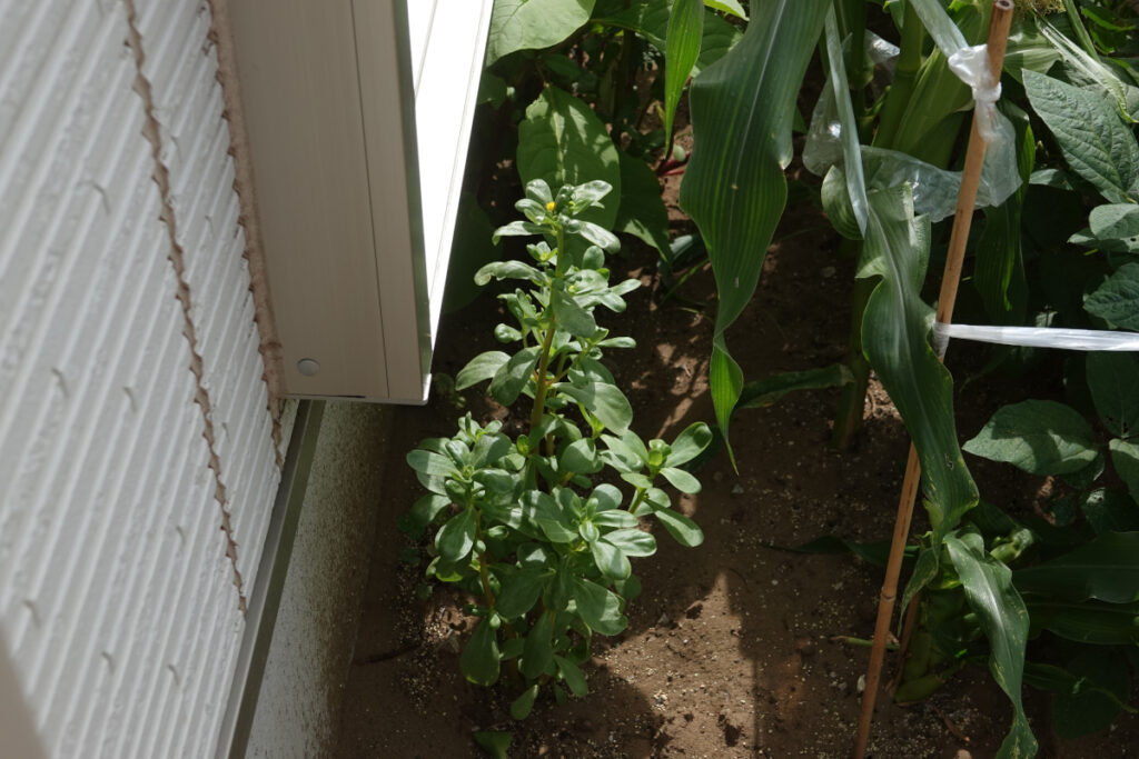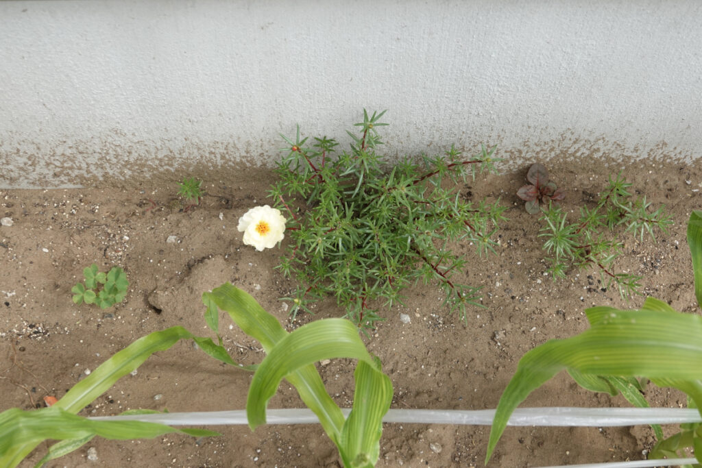 2025年6月22日、マツバボタンの橙色の花が1輪咲いた。スベリヒユにも小さい黄色い花が咲いた。