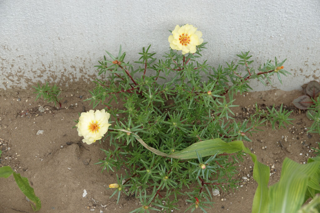 2025年6月24日、マツバボタンの薄い黄色の花が2輪咲いた。スベリヒユにも小さい黄色い花が咲いている。