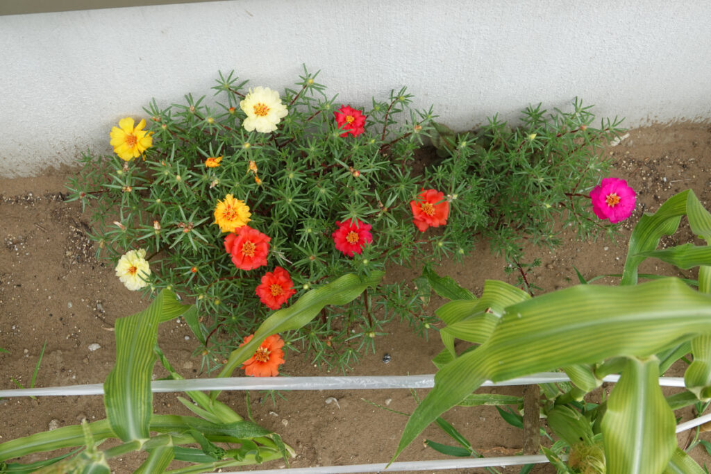 2025年7月6日、マツバボタンに白、黄色、朱色、橙色、赤紫色の花が全部で11輪咲いた。マツバボタンもスベリヒユもテリトリーを広げている。また、株数も増えているようだ。 スベリヒユが大きくなって一部刈り取った。花が咲いていたので、多分来年、こぼれた種からまた生えるでしょう。