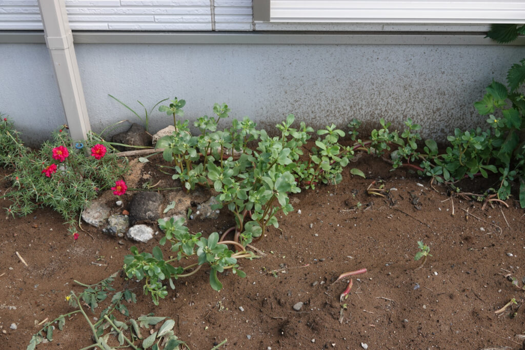 2025年6月27日、マツバボタンの白い花1輪と朱色の花が2輪咲いた。マツバボタンもスベリヒユもテリトリーを広げている。
