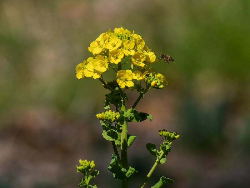 ミツバチが菜の花に近づいて来た、A honey bee approached the rape blossoms.