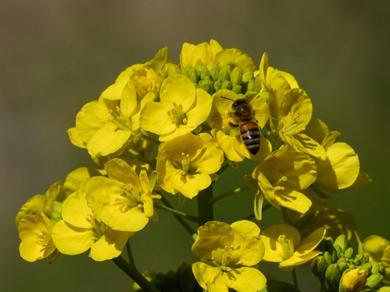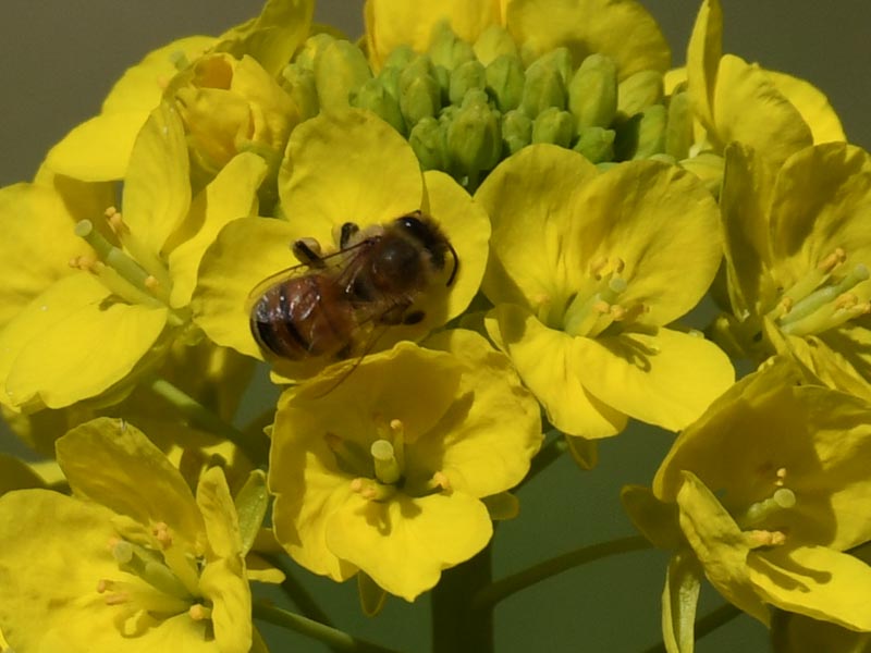 When I took a walk in Kashiwanoha Park, I saw rape blossoms blooming in the flowerbeds (Mar. 4, 2024). The yellow flowers are beautiful. A honey bee of the Apidae family visited and began sucking honey. It is smaller than the common Western honey bee (Apis mellifera). Is this a Japanese honey bee (Apis cerana japonica)?