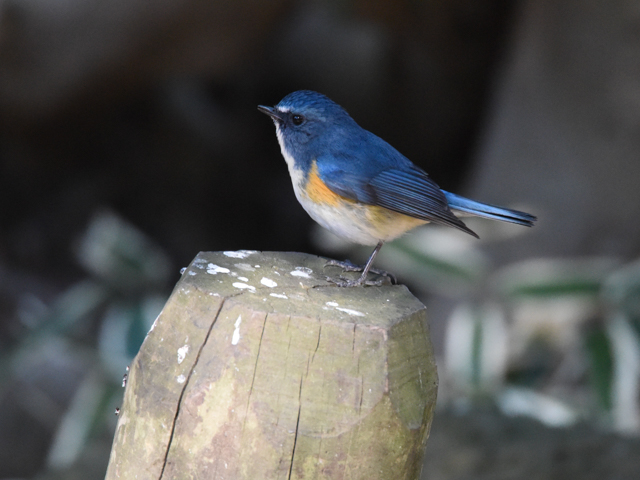 8時半ころ公園に着いて一周してみたが、誰もいないしアトリ以外の小鳥を見つけることはできなかった。9時過ぎにまた公園を 一周すると、写真を撮っている年配の人に出会った。何を撮っているのか尋ねると、「ルリビタキと言う小鳥がいるんです。」と言う。 カメラは灌木の方向を向いていたが、暗い茂みなので小鳥を見つけることはできなかった。しばらくすると、小鳥が飛び出して近くの木の杭に止まった。 ほんとだ、ルリビタキだ。