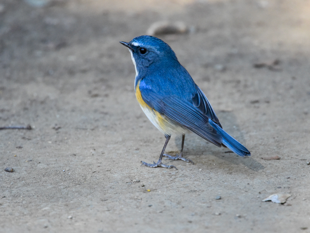 ルリビタキはしばらく杭に止まっていたが、また飛んで近くの地面に降りた。ルリビタキは私たちを警戒しているようには見えない、 私はとても驚いた。