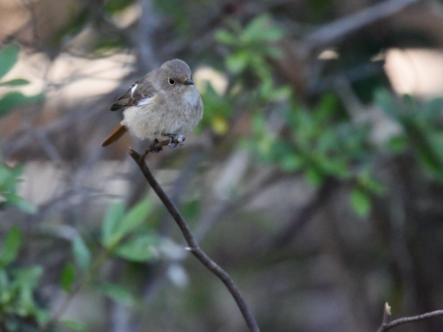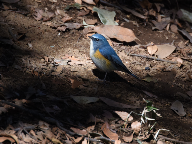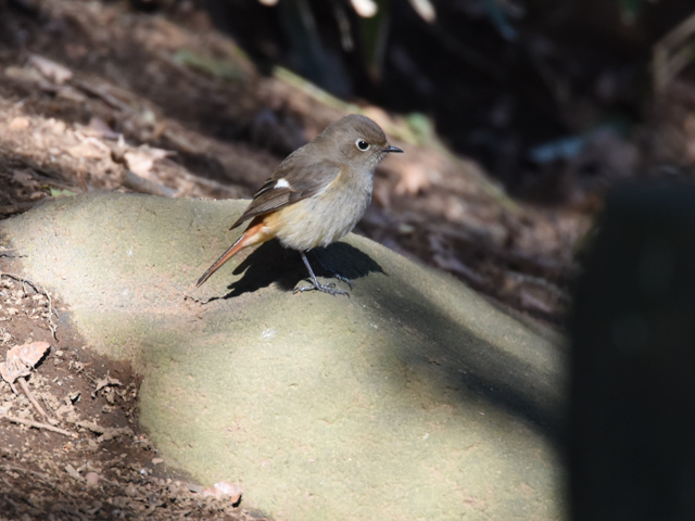 突然ジョウビタキのメスが現れた。先のカメラマンが言うには「このメスのジョウビタキは気が強くって、オスのルリビタキを追い払うんですよ。」 ルリビタキは通路から山際の斜面に移動した。なるほど、ジョウビタキはルリビタキを追い払っているように見えた。
