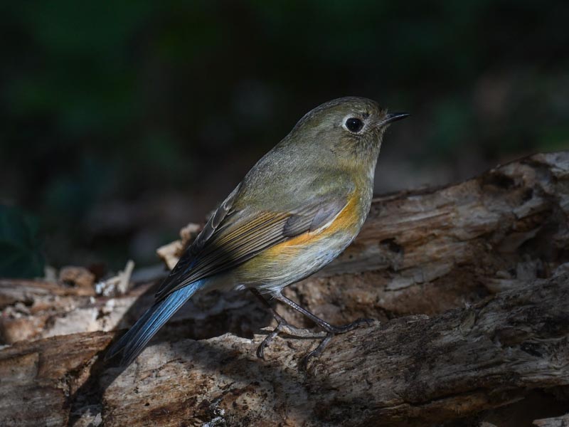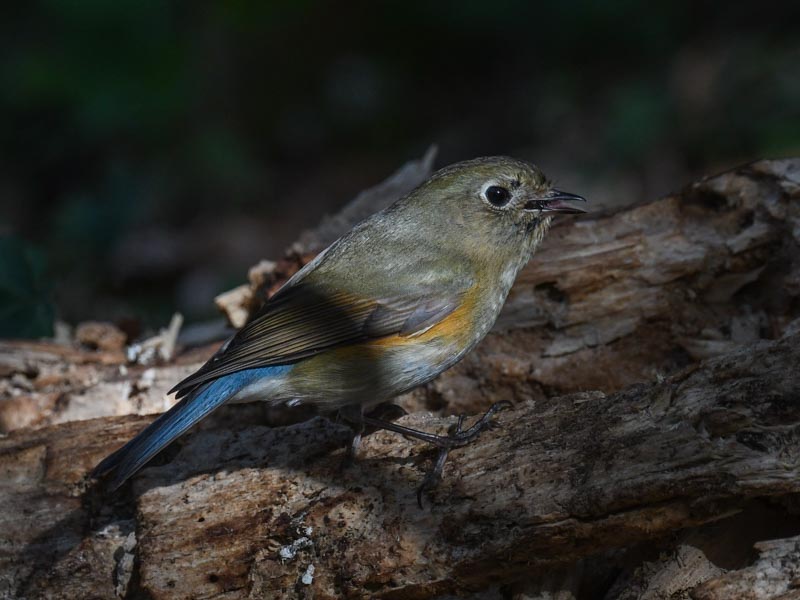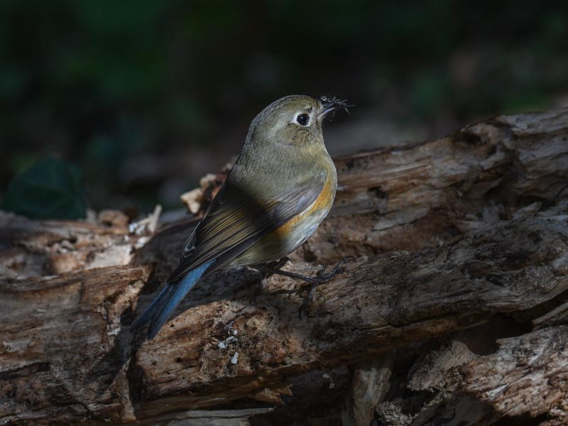 ルリビタキが朽木の所で虫を見つけた, A Red-flanked bluetail found a worm on a rotten tree.