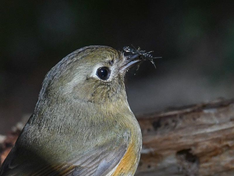 On January 19, 2024, I went bird watching for the first time this year to Mizumoto Park. A female Red-flanked bluetail found a worm on a rotten tree in a somewhat dimly lit area of the forest. It’s a black cave centipede like worm. The Red-flanked bluetail held the insect in its mouth for a while, but then swallowed it.