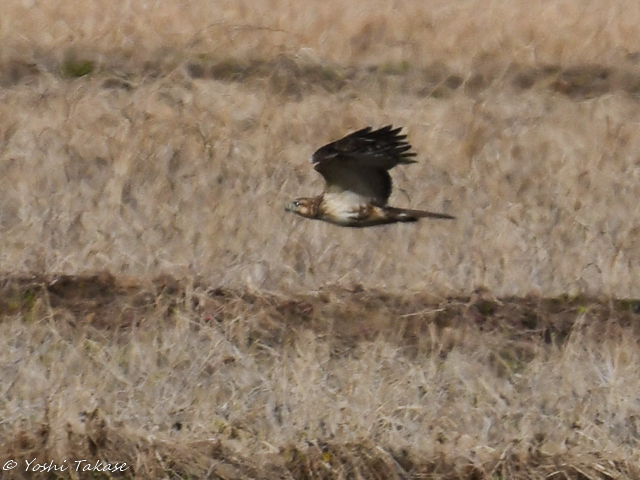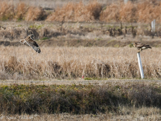 On January 14, 2020, when I arrived at about 1:30 pm, I saw a buzzard flying over the rice field. And the short-eared owl was already flying. The short-eared owl was flying above the sky but soon came down to the rice field. Here, the owl came upon the buzzard that was perching on a stake. Immediately after, the owl flew away from the buzzard. 15 minutes later, I saw the owl resting in the rice field.