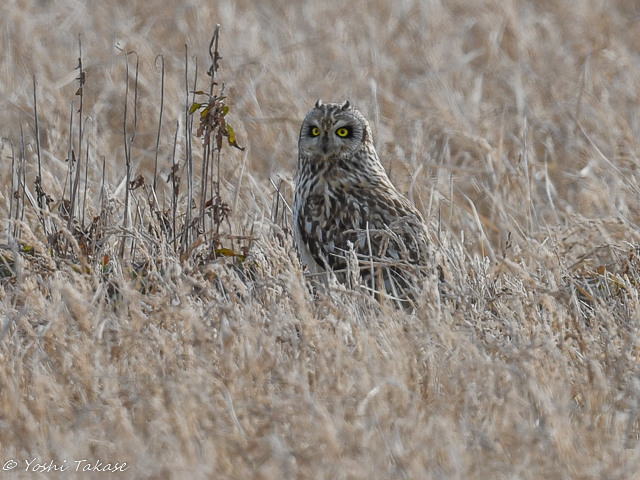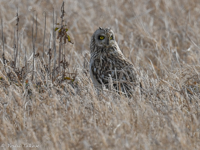 A photographer told me, “The Owl is resting in the fields after fighting with buzzards, and the ear-tufts are stretching because it is excited.” The owl was here for quite some time.