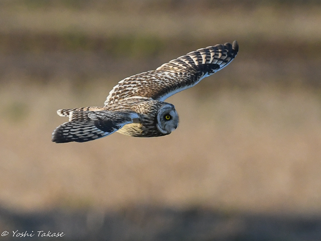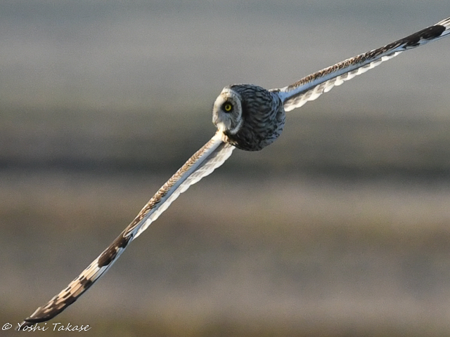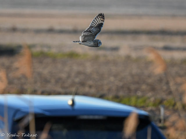 午後4時を過ぎ薄暗くなってきたので、私はそろそろ帰ろうと思って橋から移動した。この時、コミミズクが近づいてきた。飛ぶコミミズクの顔が正面から見えた。
