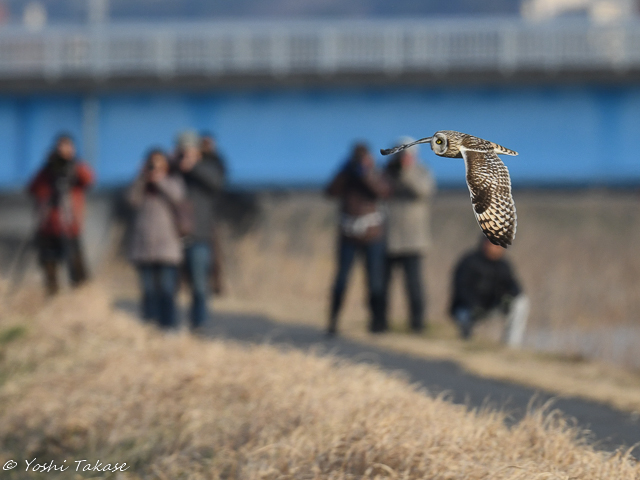 2020年2月7日、順光撮影を目的に橋の南側にある手賀川の堤防に行った。コミミズクが手賀川の橋を背景にしてほぼ順光状態で飛んだ。堤防には6,7人の撮影者がいたが私は堤防の上を歩行中だったので、偶然、彼らとは反対側から順光状態でコミミズクを撮影できた。