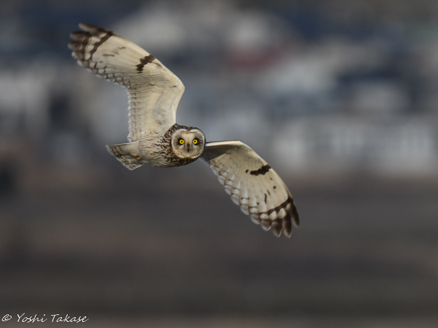 This time, the owl flew north of the embankment. The owl turned the face to me while flying. Is it because the own heard the shutter sound? But the owl came closer and flew away. I was able to take pictures in direct light condition.
