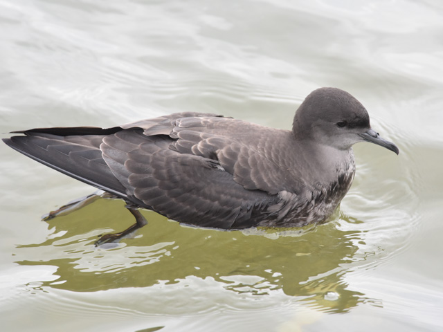 カモメとは異なりくちばしの先が鉤状に尖っているのでミズナギドリのようだ。全身が茶褐色っぽいのでハイイロミズナギドリか ハシボソミズナギドリらしい。この2種は大変良く似ていて区別が難しい。後者は前者よりくちばしが短く細いという特徴があるので、 BHI (Bill Head Index)を定義して数値判定を行った。その結果、このミズナギドリはハシボソミズナギドリと判定された。