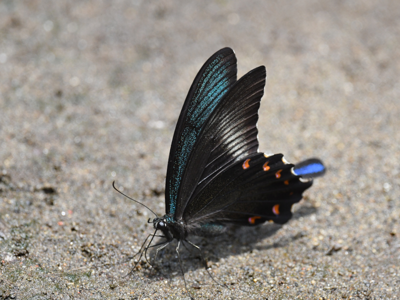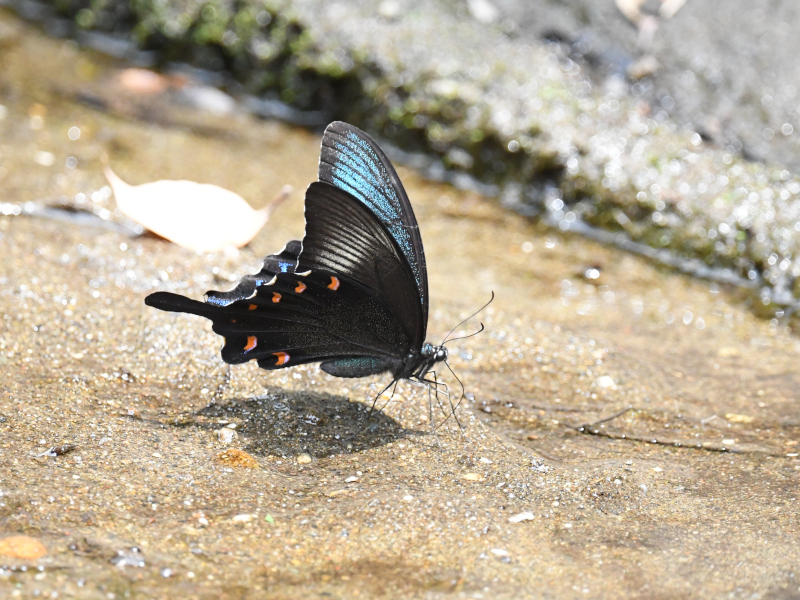 湿った地面から吸水する習性をもつオスのカラスアゲハ, A male swallowtail butterfly that has the habit of absorbing water from damp ground.