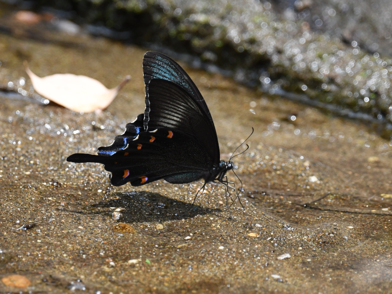 While walking in Kashiwanoha 2nd Waterside Park, I spotted a black swallowtail butterfly absorbing water from the damp ground. I could see a beautiful metallic green color on the front wings. It looked like a male Chinese peacock (Papilio dehaanii). The swallowtail butterfly kept drinking water for a long time.