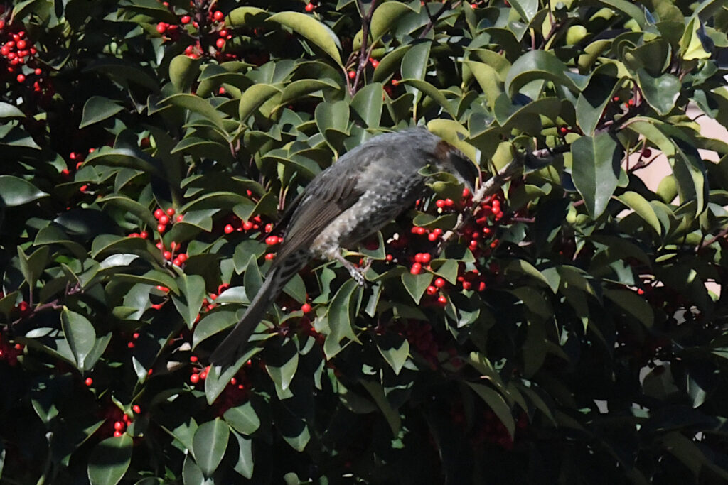 On January 1, 2026, I saw no wild birds other than ducks and crows in Mobara Park. On the way home, I saw a brown-eared bulbul pecking at red berries in a residential area. It seemed to be eating holly(?) berries.