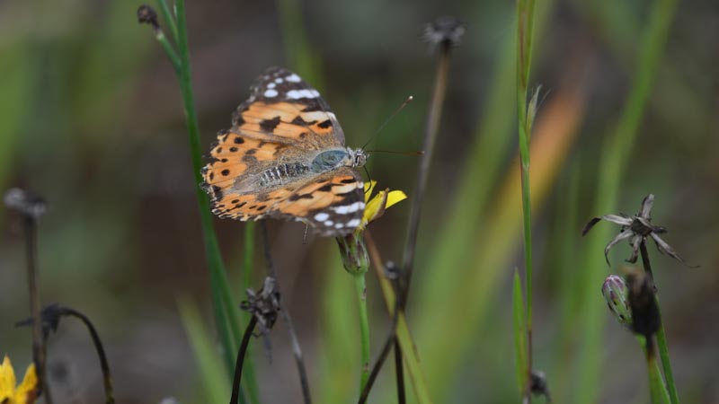 It’s autumn, and there are a few flowers left in the grassy glade. A Painted Lady is sucking nectar from the flower (Sep. 23, 2023).