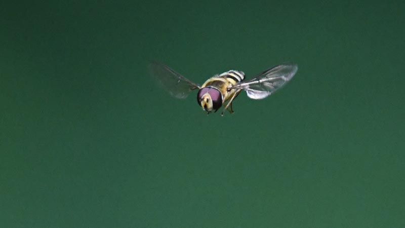 朝、雨が降って水滴がヨシの葉にたくさん付いた。イナゴの体に付いた丸い水滴の中に池の景色が屈折して見えている。