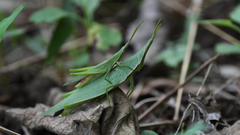 It rained in the morning and many drops of water were attached to the reed leaves. The scenery of the pond is refracted in the round water droplets on the locust’s body.