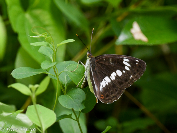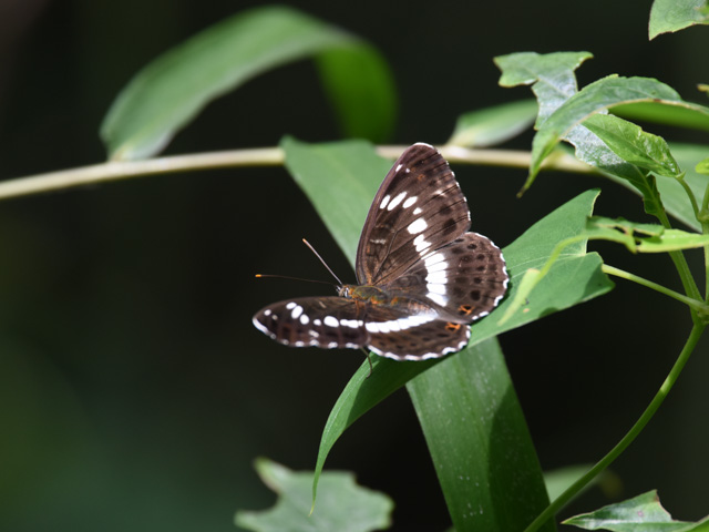 2016年7月12日、こんぶくろ池自然博物公園を散歩した。自然林の散策道路を歩いていると、近くの木の葉にチョウが止まった。 こげ茶色の翅の表面に一条の白斑列があるのでイチモンジチョウのようだ。