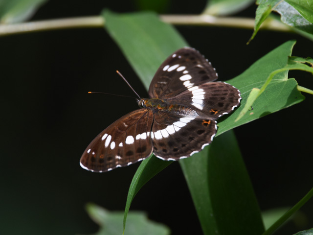 こげ茶色の翅の表面に一条の白斑列があるイチモンジチョウ, White admiral with a row of white spots on the surface of its dark brown wings.
