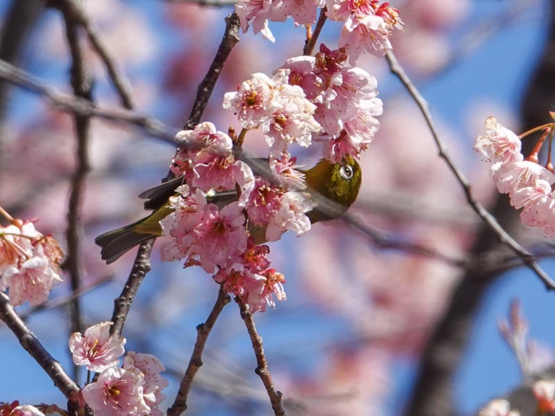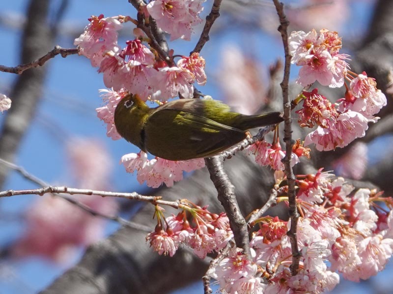 It seems that the full bloom period of cultivar “Tsubaki-kanzakura” flowers is passing (Mar. 11, 2024). In addition to the brown-eared bulbuls, several Japanese white-eyes were also collecting nectar from the cherry blossoms. I often see large-bodied bulbuls chasing away white-eyes.