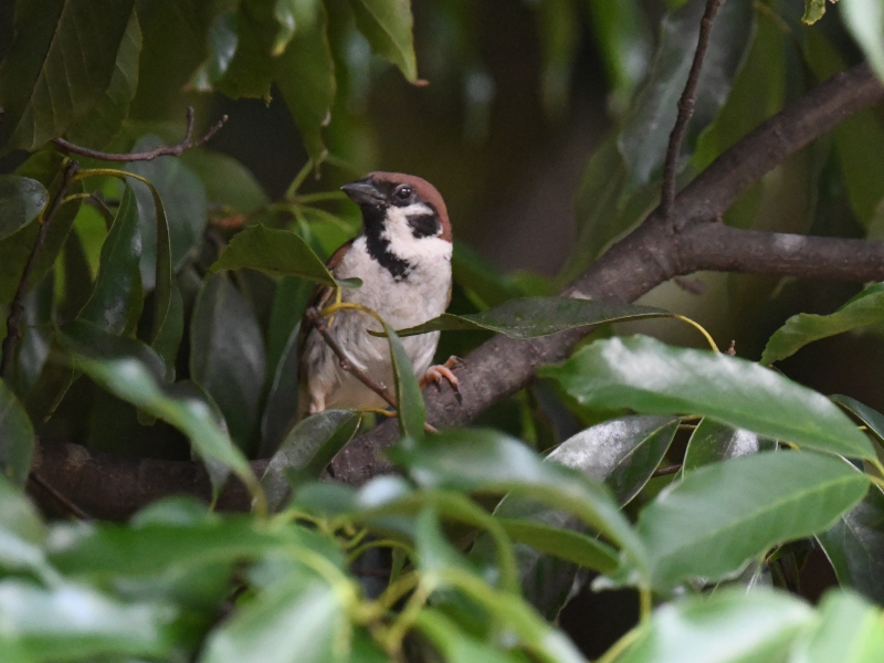 In the past, sparrows were the most familiar wild birds to Japanese people. These days, they are rarely seen. One reason is said to be that modern houses do not have spaces for sparrows to build nests. On this day, I saw several sparrows by the hedge in the park. They seemed to be young sparrows that had left the nest this year. Japanese sparrows are a minority around the world, and in many countries, you will usually see the slightly larger house sparrow, which does not have black spots on its cheeks.